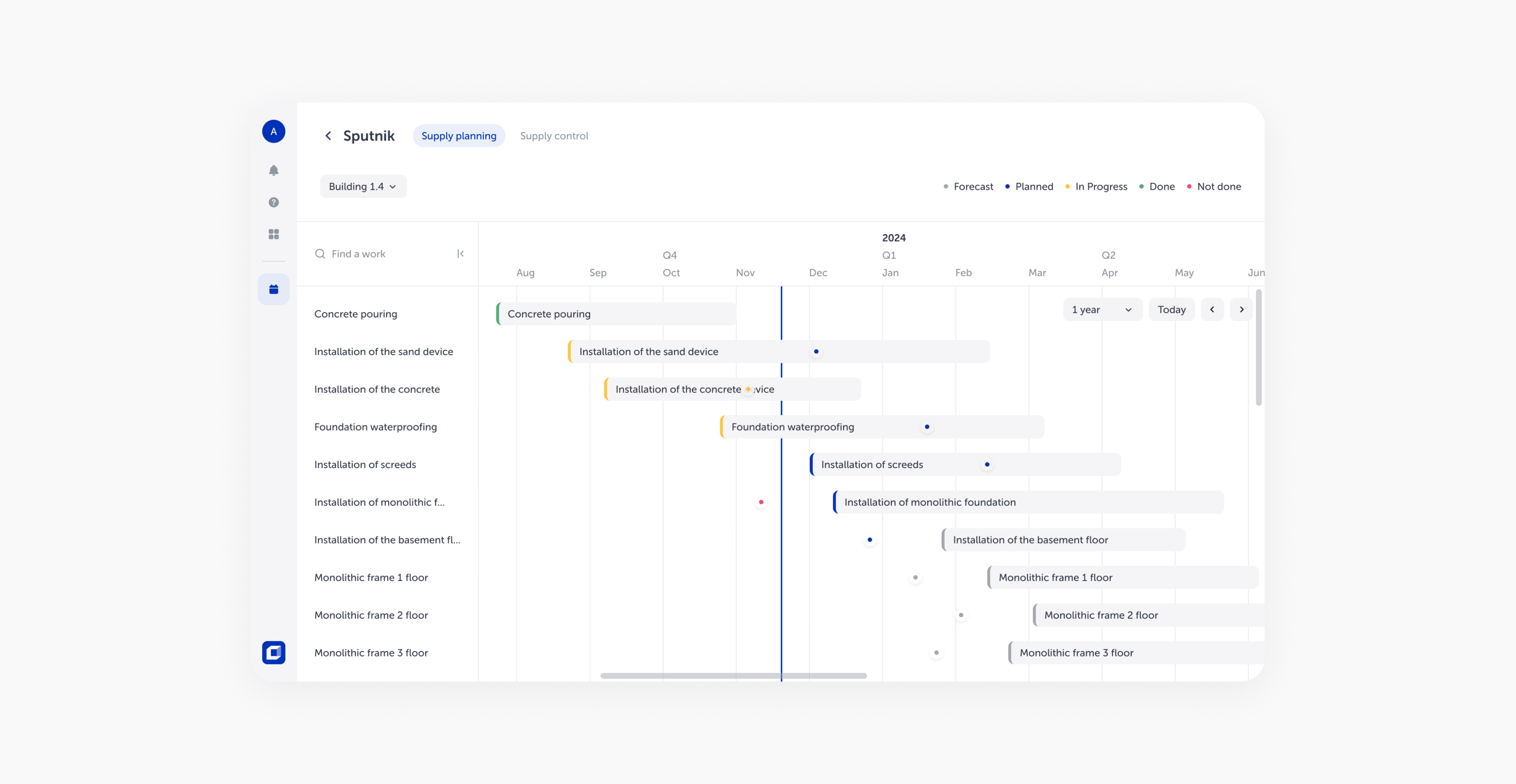 We introduced a Gantt chart that not only integrates construction scheduling and material ordering, but also provides increased security through individual user accounts. This system facilitates planning and real-time tracking of construction progress, complemented by a legend system for interpretation of work and material statuses