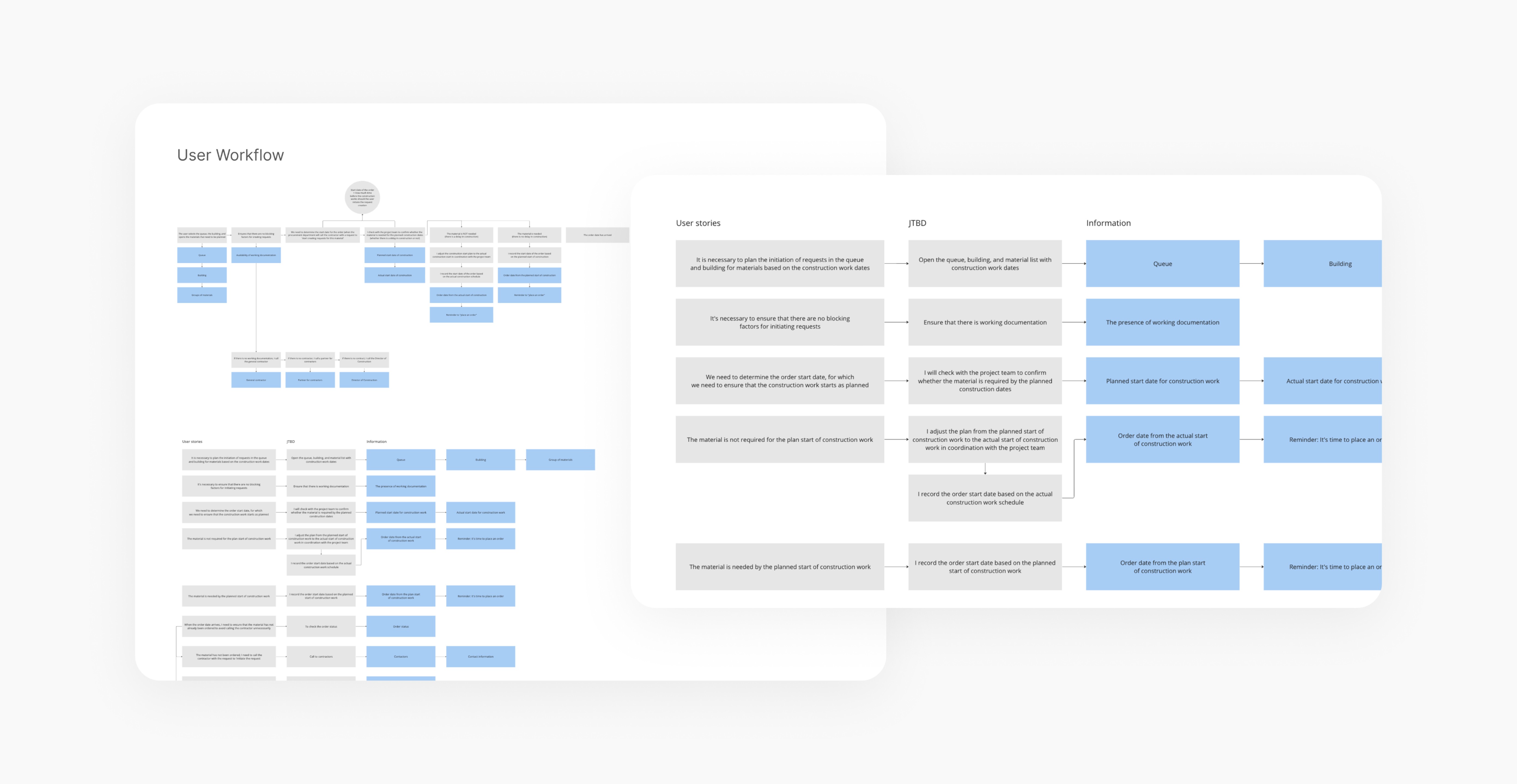 This diagram visually represents user stories, jobs to be done, stages, requirements, actions, and the information used by our future users in their current work processes and with the tools they currently use